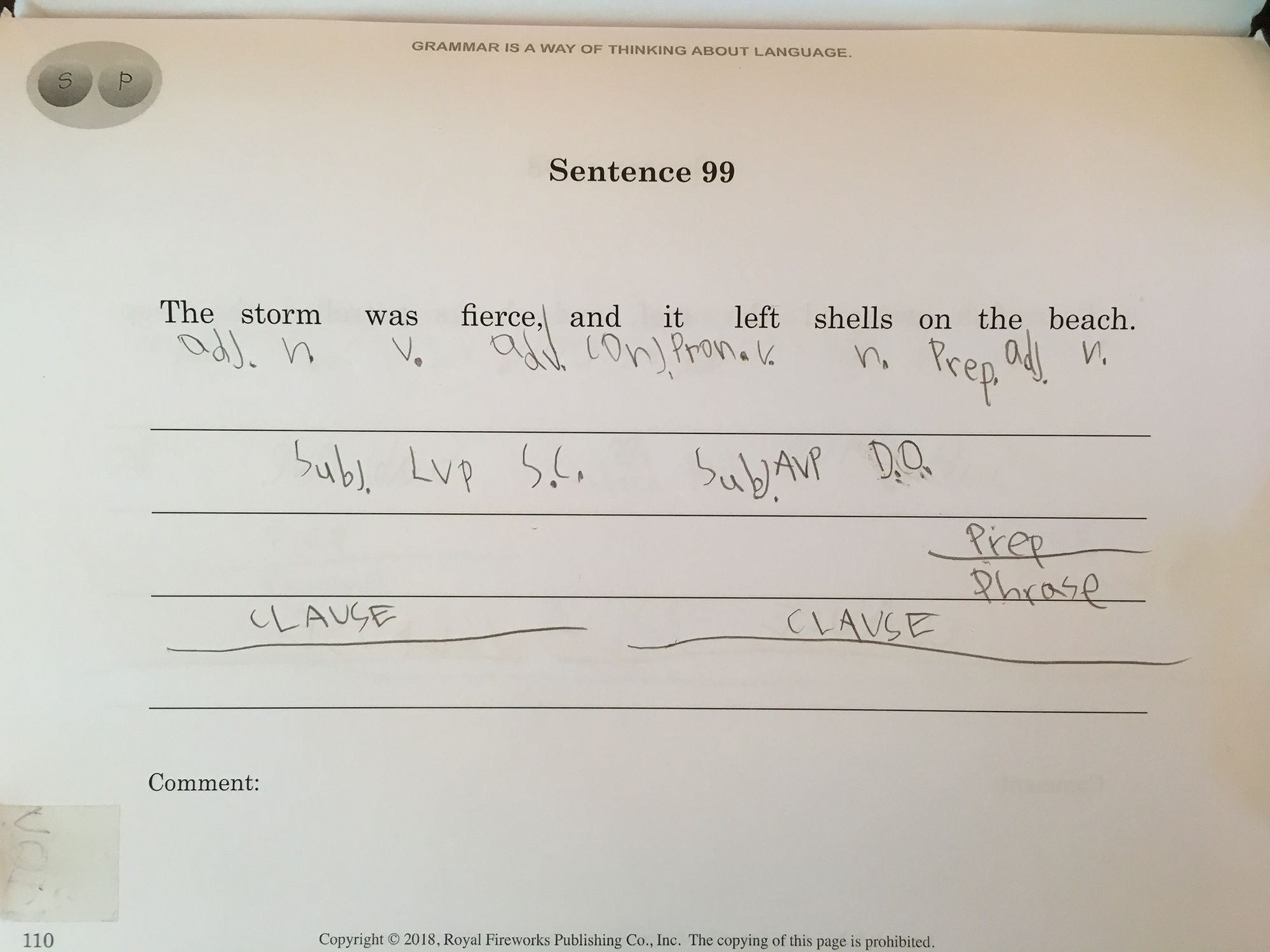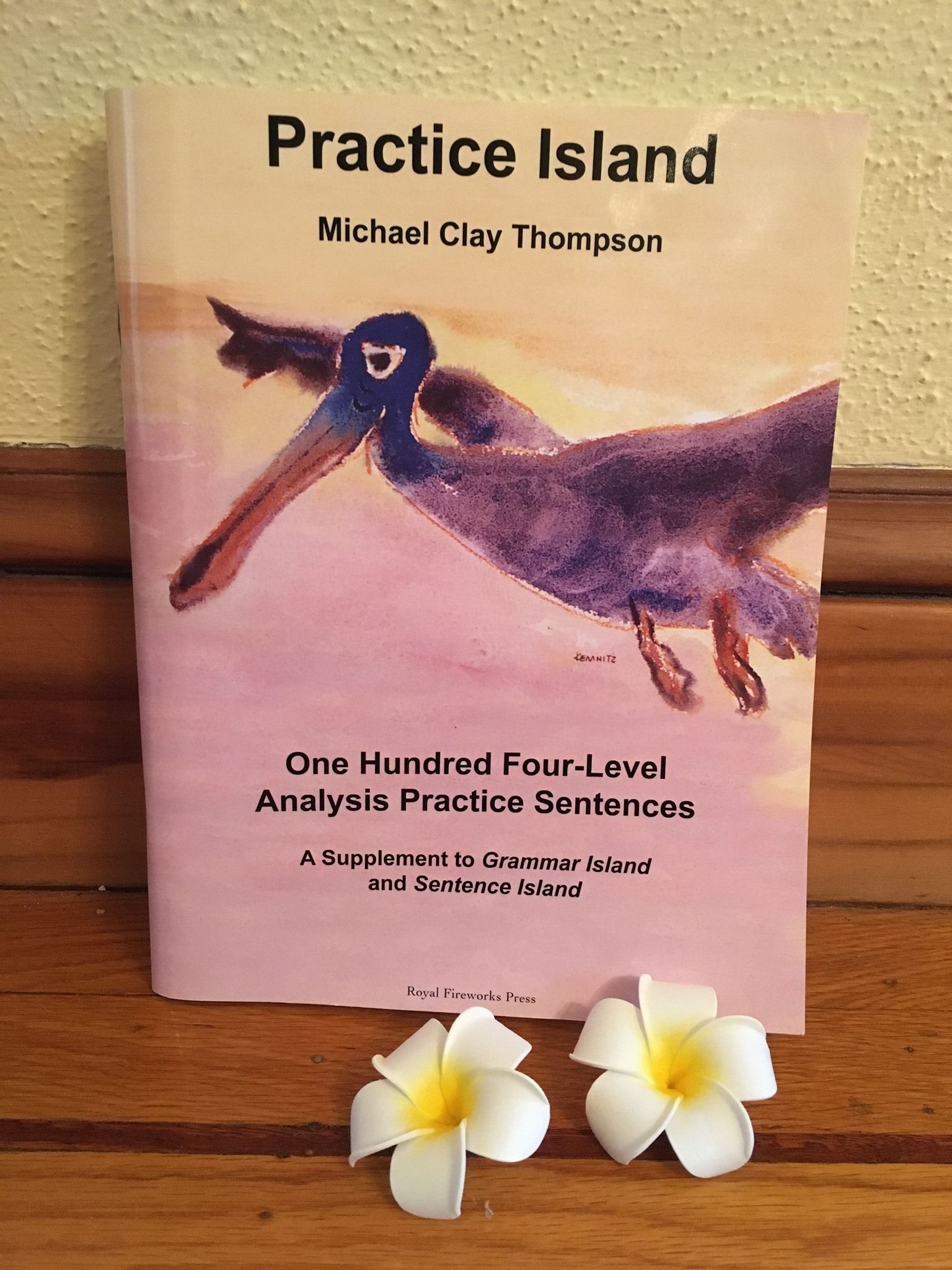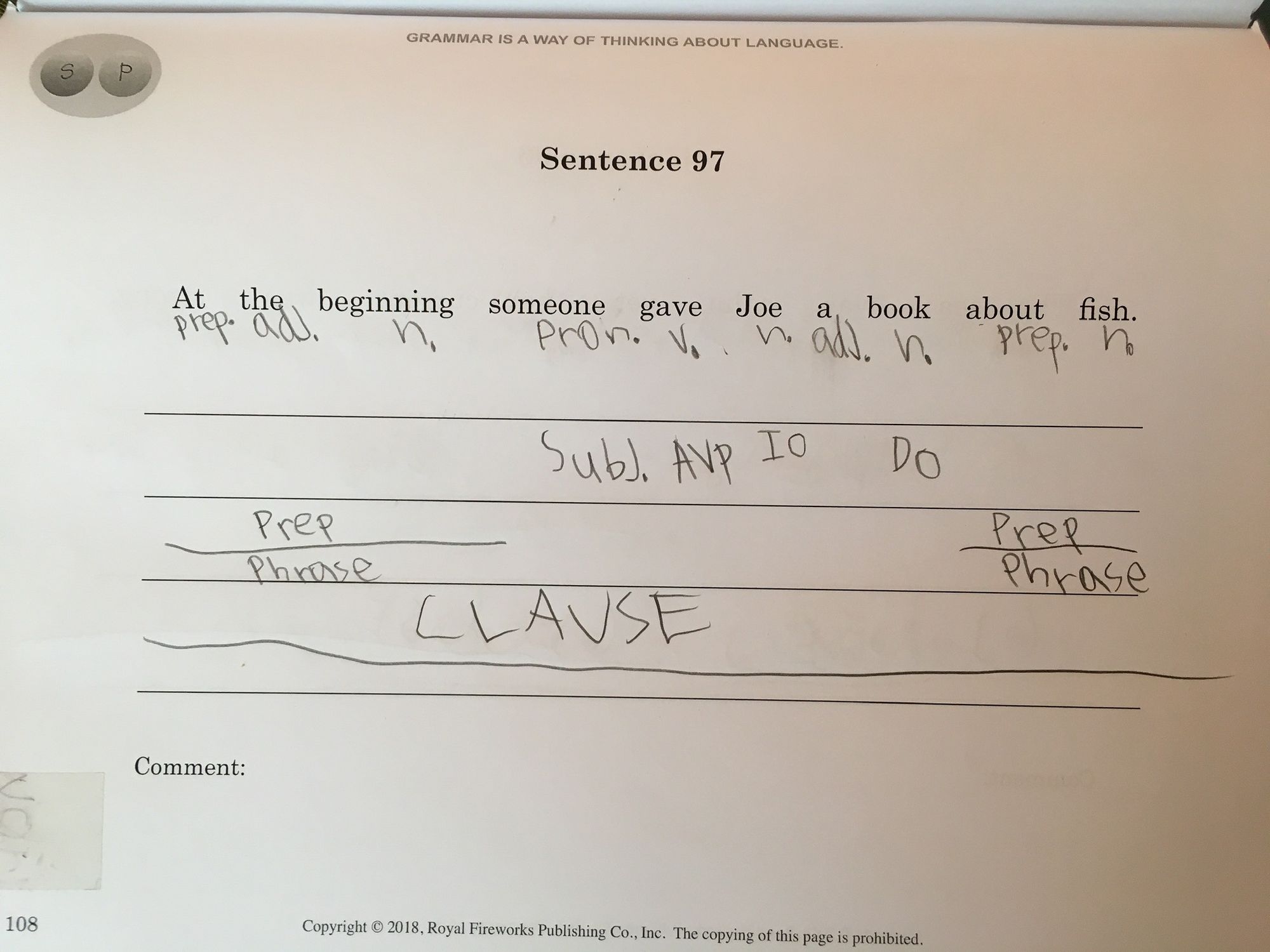 The Michael Clay Thompson language arts curriculum comes with a big ol’ book of 100 sentences to practice grammar analysis. Each sentence is analyzed in four ways: 1) each word’s part of speech (noun, adjective, conjunction, etc.), 2) identify the parts of the sentence (subject, action or linking predicate, objects, etc.), 3) phrases (so far just prepositional phrases), 4) clauses (so far just identifying where they are, not what kind).